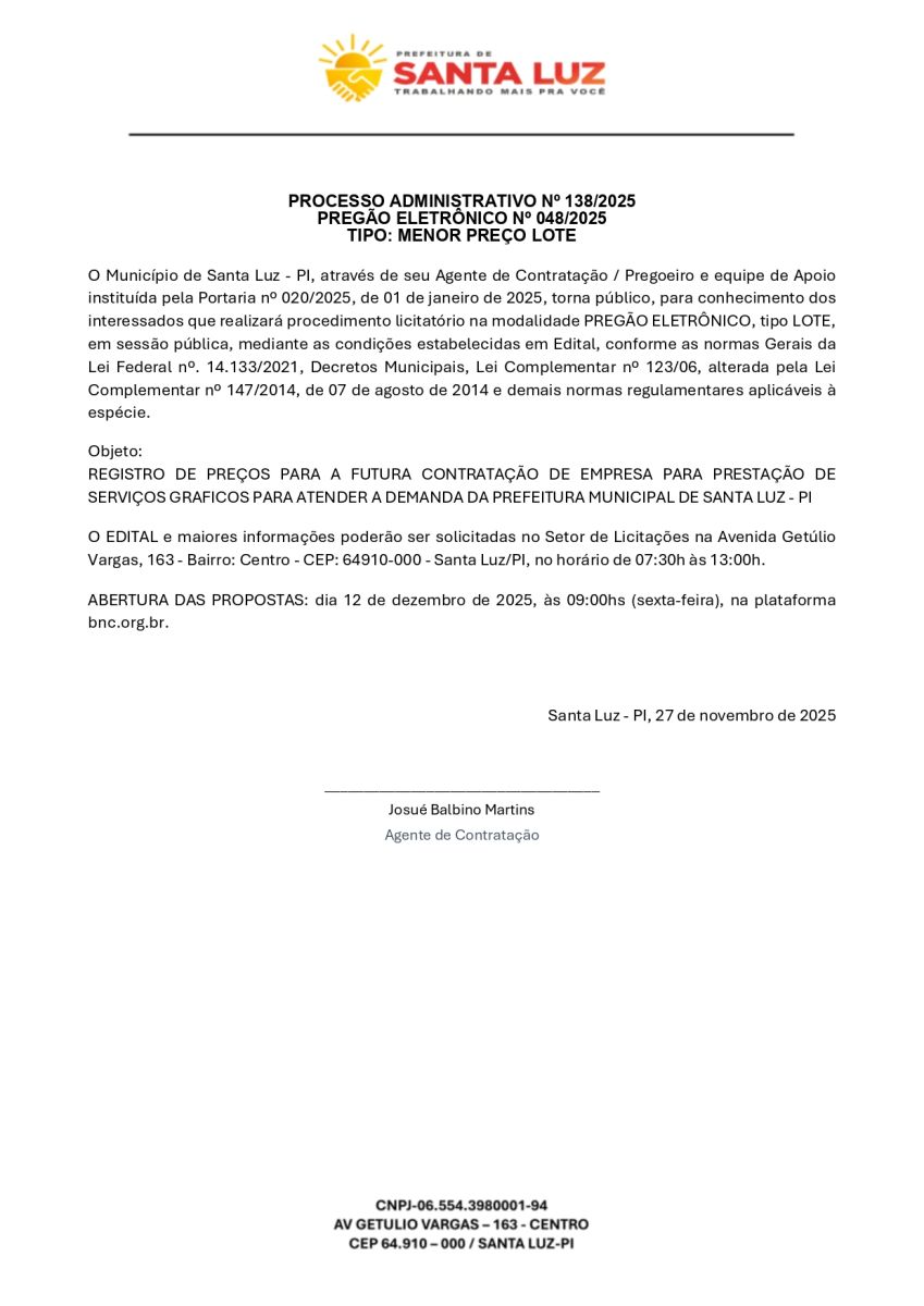 AVISO DE PREGÃO ELETRÔNICO Nº 048/2025