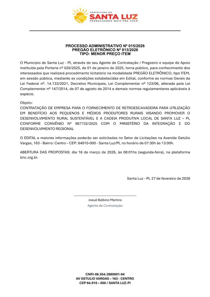 Avenida Getúlio Vargas, 163 - Bairro: Centro - CEP: 64910-000 - Santa Luz/PI