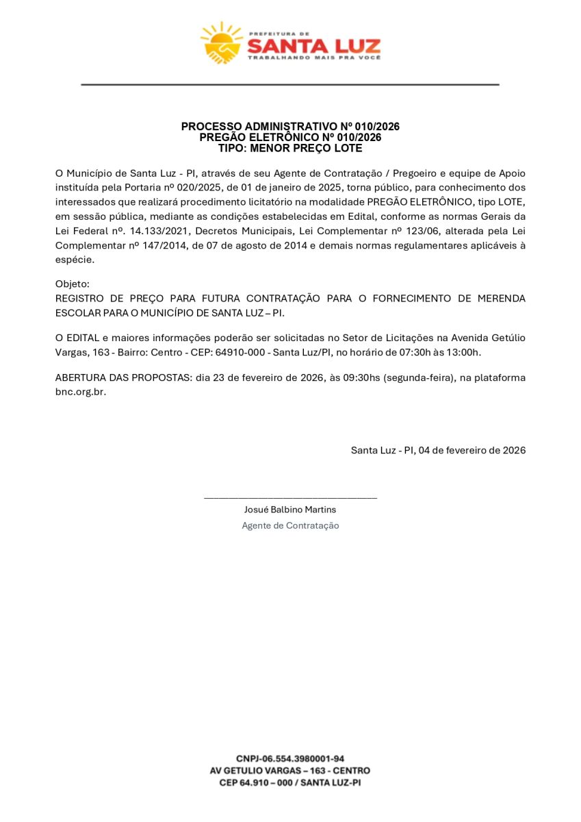 AVISO DE PREGÃO ELETRÔNICO Nº 010/2026