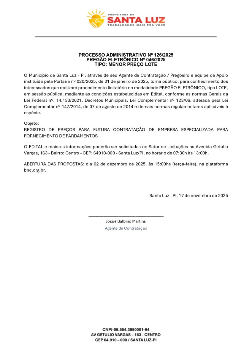AVISO DE PREGÃO ELETRÔNICO Nº 046/2025